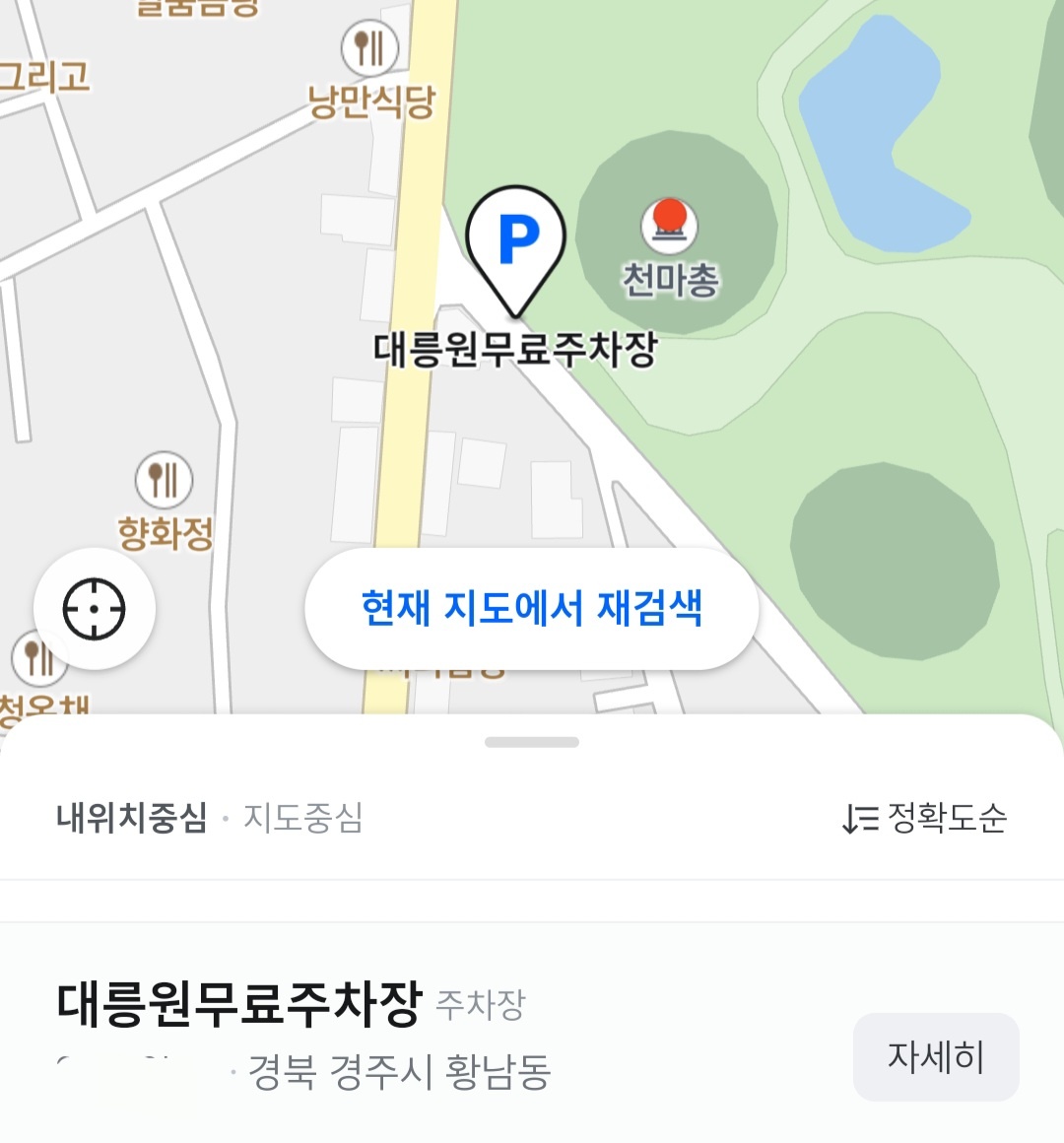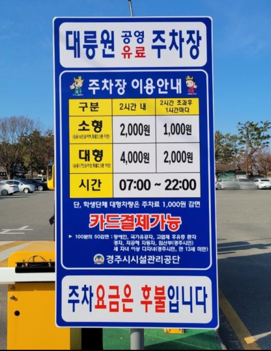 천마총 근처 무료주차장 대릉원 (T카드에 ‘대릉원 무료주차장’이라고 적혀있음)