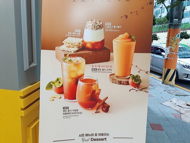 음료의 전체적인 질감이 스무디의 느낌을 잘 살렸고, 음료가 굳어 있는 부분이 마치 홍시처럼 보였고 홍시의 질감이 표현된 것 같아 개인적으로는 음료의 주제를 잘 살린 것처럼 보였습니다.