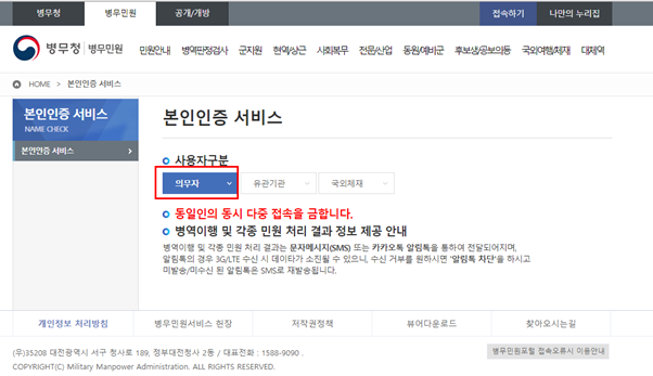재향 군인의 병역 번호를 조회하려면 신원을 확인해야 합니다.. 사용자 범주를 필수로 선택하십시오..