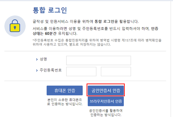 빌트인 로그인 창이 나타나면 이름과 주민등록번호를 입력한 후 공인인증서로 인증합니다.. 공인인증서가 없으시면 휴대폰인증으로도 가능합니다..