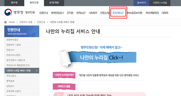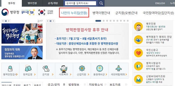 병무청 홈페이지 접속 시 상단 나만의 웹사이트(불만)’ 메뉴를 클릭하세요.
